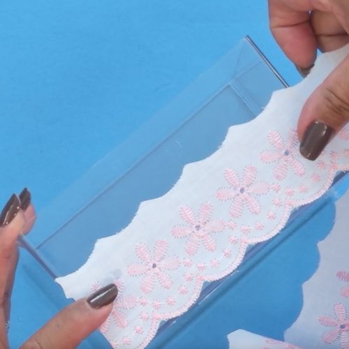 23. Corte o excesso de bordado inglês e cole as pontas no canto da caixa para dar acabamento.