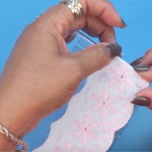 06. Continue o alinhavo pela borda da fita, até fixar o segundo triângulo.