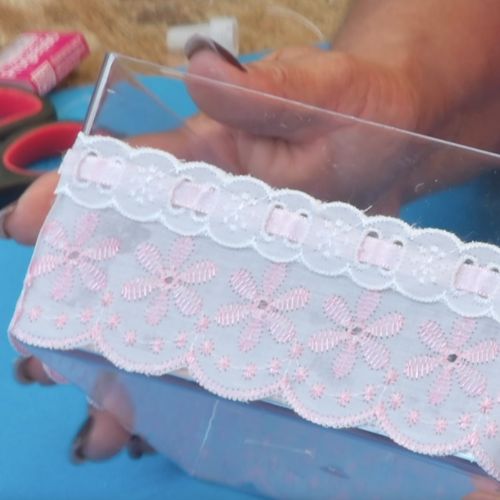 27. Cole a fita de cetim nº2 ao redor da tampa da caixa, utilizando a cola universal.