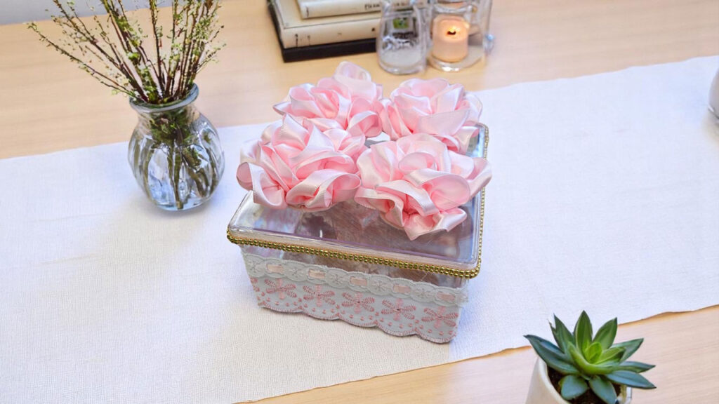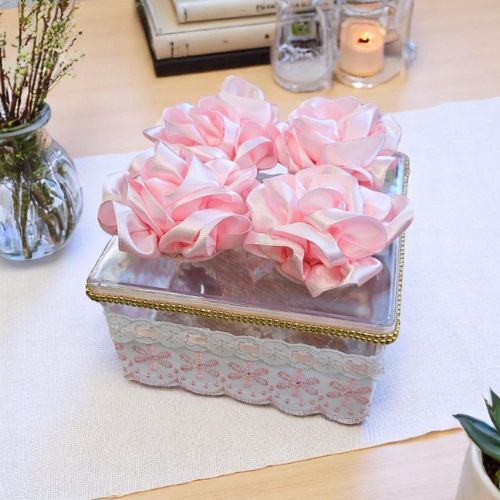29. Aplique cola quente no verso das rosas e cole-as sobre a tampa da caixa.